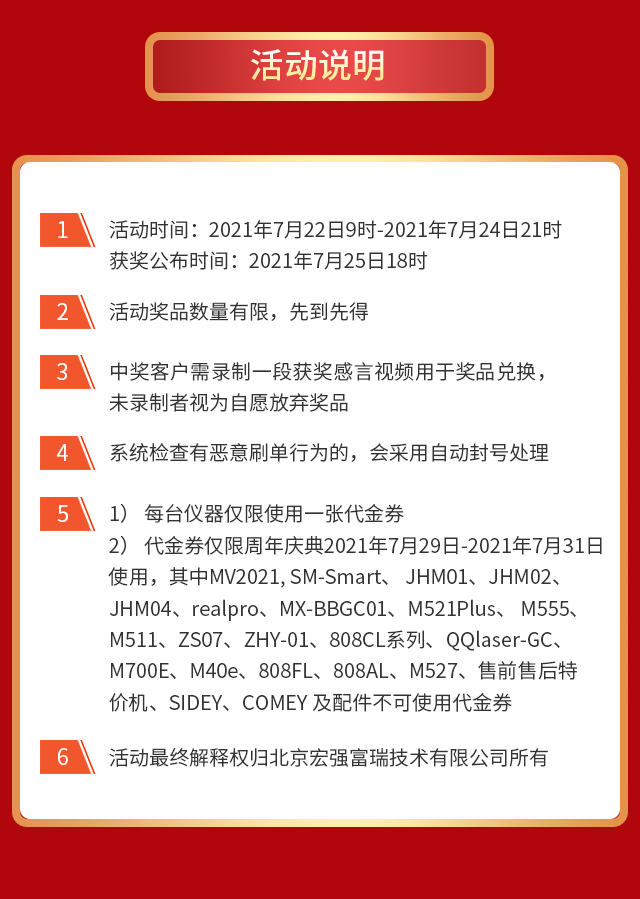 好消息!好消息!一年一度的周年庆典活动又来啦!快来参加活动二吧,将会赢取洗眉机大奖,还有更多代金券,活动时间是2021.7.22-2021.7.24,接下来宏强小编为您详细介绍一下: