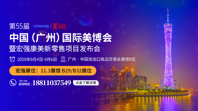 第55届中国(广州)国际美博会将在2020年9月4日-6日拉开序幕,北京宏强与您共赴美业盛宴,这次北京宏强将以全新的面貌亮相美博会。美业的朋友们,快来报名参加美博会吧!